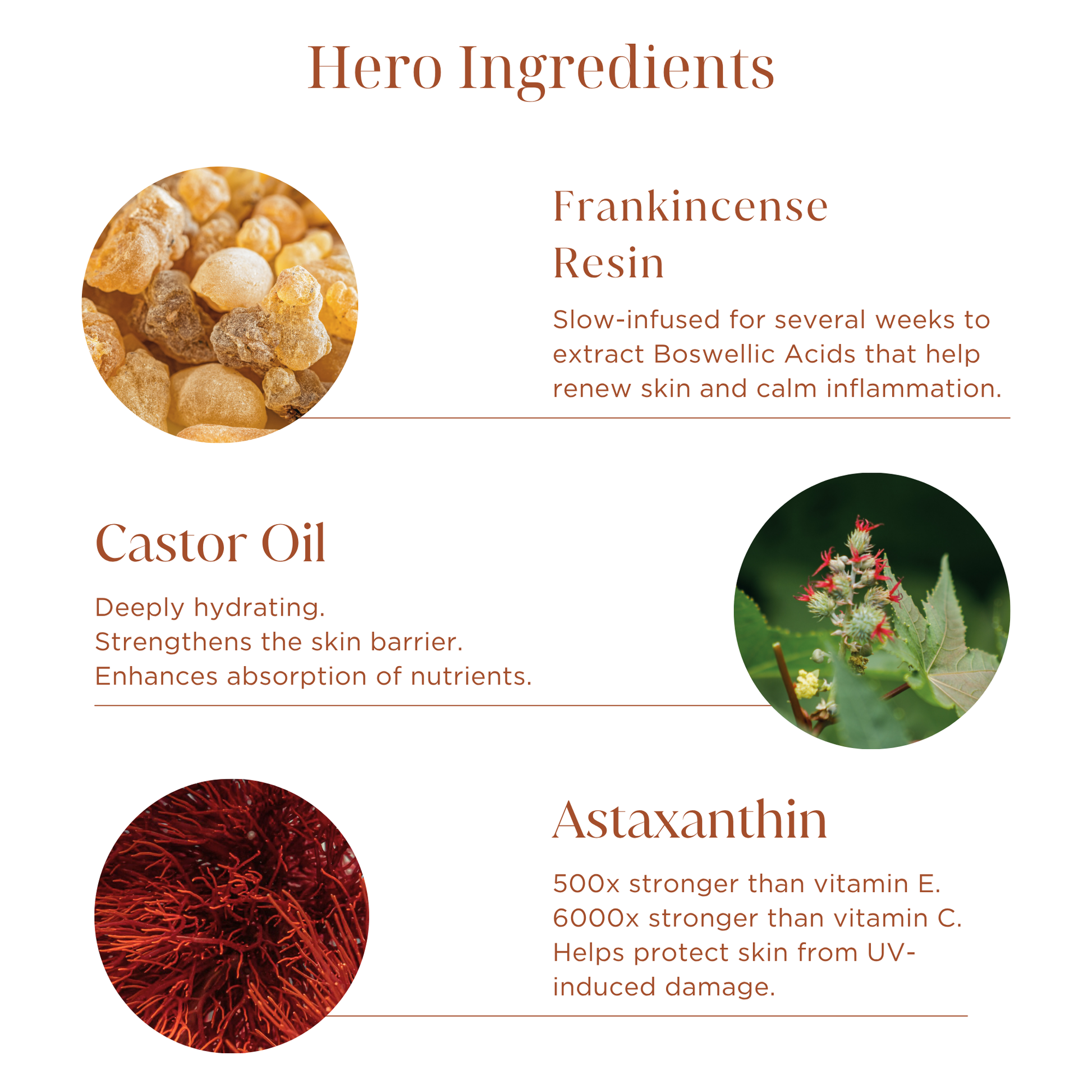 Ricinus Communis Seed (Castor) Oil, Simmondsia Chinensis (Jojoba) Seed Oil, Rosa Rubiginosa Seed Oil (Rosehip), Nigella Sativa (Black Cumin) Seed Oil, Prunus Amygdalus Dulcis Oil, Boswellia Carterii, Haematococcus Pluvialis Extract, Helichrysum Italicum Flower Oil, Lavandula Angustifolia Oil, Citrus Aurantium Flower Oil